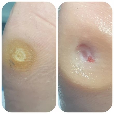 Polega na zaaplikowaniu preparatu zmiękczającego oraz usunięcia zrogowaciałego